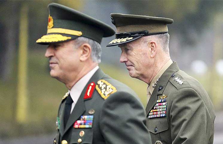 من هذه الإشارات أن رئيس هيئة الأركان العامة التركي خلوصي أكار، التقى أمس الجمعة، نظيره الأمريكي جوزيف دانفورد، وبحثا، مكافحة المنظمات الإرهابية في العراق وسوريا وعلى رأسها تنظيم «الدولة الإسلامية»… ومنظمة «بي كا كا» (حزب العمال الكردستاني التركي)، وتوافقا الرأي، بحسب وكالة الأناضول التركية، بهذا الخصوص.
