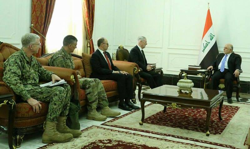 جاء ذلك خلال استقباله وزير الدفاع الامريكي جيمس مايتس والوفد المرافق له, وجرى خلال الاجتماع بحث تعزيز العلاقات بين البلدين في المجالين العسكري والامني والحرب على داعش ومعركة تحرير الساحل الايمن للموصل .