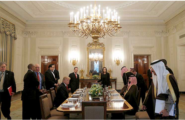 غداء العمل في «غرفة الطعام العائلية القديمة» في البيت الأبيض، ودعوة الصحافيين للتصوير، وحضور نائب الرئيس مايكل بنس وصهره جاريد كوشنر كانت من أشكال كسر بروتوكولات اللقاء الدبلوماسي إظهارا لحفاوة واهتمام من إدارة الرئيس الأمريكي دونالد ترامب بزيارة ولي وليّ العهد السعودي محمد بن سلمان.
