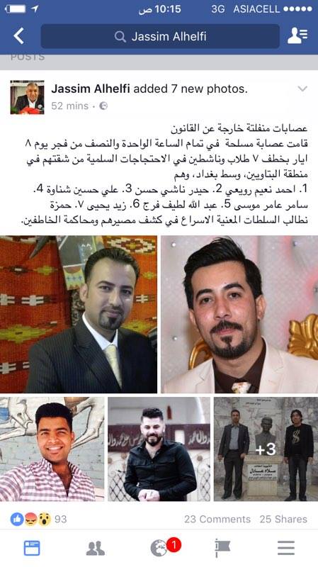 ونشر الحلفي على صفحته الشخصية في موقع التواصل الاجتماعي “فيسبوك”، الإثنين (8 أيار 2017)، أن “عصابات منفلتة خارجة عن القانون، قامت في تمام الساعة الواحدة والنصف من فجر اليوم بخطف 7 طلاب وناشطين في الاحتجاجات السلمية من شقتهم في منطقة البتاويين”.