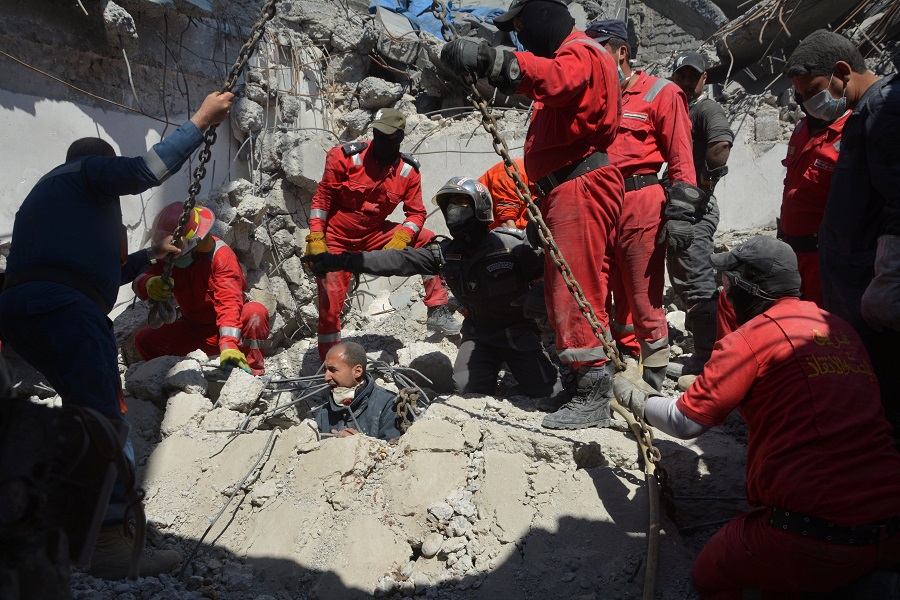 Iraqi firefighters look for bodies buried under the rubble, of civilians who were killed after an air strike against Islamic State triggered a massive explosion in Mosul, Iraq March 27, 2017. REUTERS/Stringer EDITORIAL USE ONLY. NO RESALES. NO ARCHIVE.
