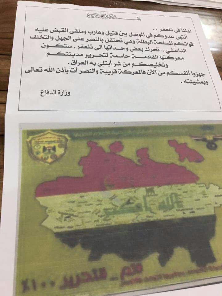 Posted in أهم الأخبارالعمليات المشتركة: طائرات القوة الجوية تلقي مئات الآلاف من المنشورات على مركز مدينة تلعفر تتضمن توصيات واخبار للمواطنينby iraq•19 أغسطس، 2017•0 iraq More by iraq