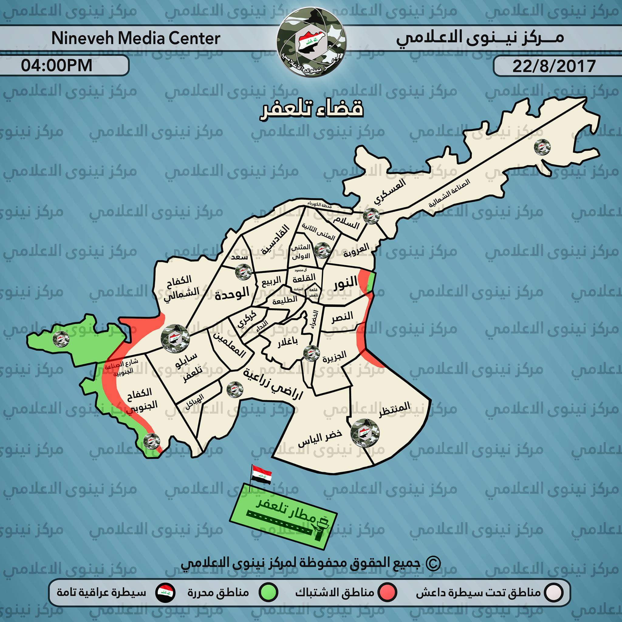 وذكر بيان لمديرية إعلام هيئة الحشد الشعبي، اليوم ( 23 آب 2017) أن قوات الحشد والقطعات العسكرية بإسناد من طيران الجيش حققت تقدماً، صوب قضاء تلعفر من المحورين الشرقي والغربي، حيث تمكنت من استعادة أحياء “التنك والكفاح الشمالي والجنوبي والعاشق الاولى والثانية”، إضافة إلى السيطرة على 3 قرى غرب ناحية المحلبية وهي “شيخ ابراهيم ، عين الواح ، حمرة العرب”.