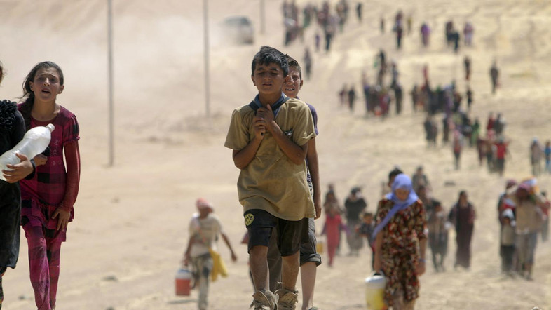 Children from the minority Yazidi sect, fleeing violence from forces loyal to the Islamic State in Sinjar town, make their way towards the Syrian border, on the outskirts of Sinjar mountain, near the Syrian border town of Elierbeh of Al-Hasakah Governorate August 10, 2014. Islamic State militants have killed at least 500 members of Iraq's Yazidi ethnic minority during their offensive in the north, Iraq's human rights minister told Reuters on Sunday. The Islamic State, which has declared a caliphate in parts of Iraq and Syria, has prompted tens of thousands of Yazidis and Christians to flee for their lives during their push to within a 30-minute drive of the Kurdish regional capital Arbil. Picture taken August 10, 2014. REUTERS/Rodi Said (IRAQ - Tags: POLITICS CIVIL UNREST CONFLICT)