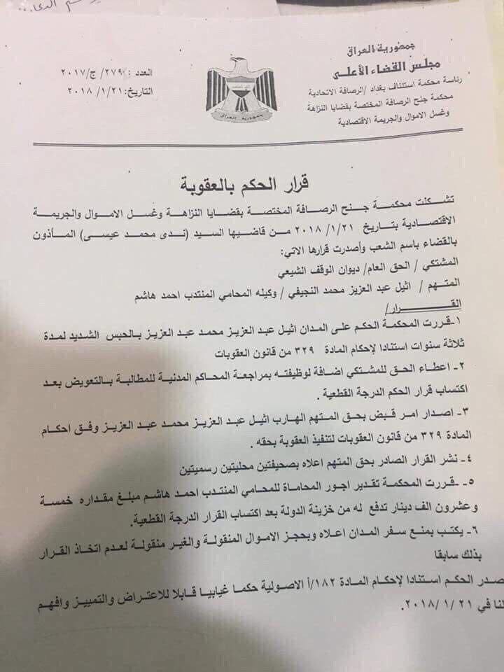 النجيفي: الإجراء الرسمي الذي كان ينبغي على الوقف الشيعي اتخاذه هو الطعن لدى المحكمة الاتحادية بقرار مجلس المحافظة كوّن المحافظ ملزم بتطبيق قرار المجلس، كما ان المكلف بالتسجيل هو مدير التسجيل العقاري وليس المحافظ ، الا انهم اختاروا المزيد من الاستفزاز بإقامة الدعوى الجزائية ضدي وقد قابلتها كذلك بعدم اعلان التفاصيل لكي لا يستغل المتطرفون والإرهابيون هذا الموضوع