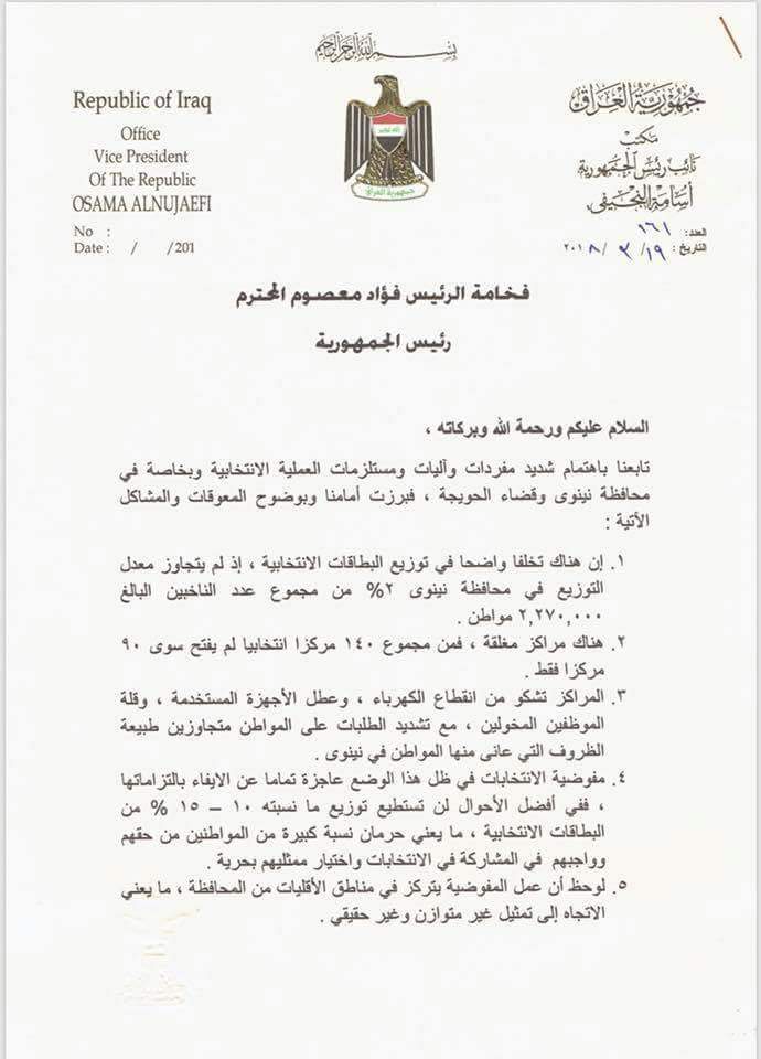 خاطب نائب رئيس جمهورية العراق أسامة النجيفي، اليوم الاثنين، رئيس الجمهورية، ورئيس الوزراء، وممثل الأمين العام للأمم المتحدة، بصعوبة توفير المناخ الملائم للعملية الانتخابية في محافظة نينوى.