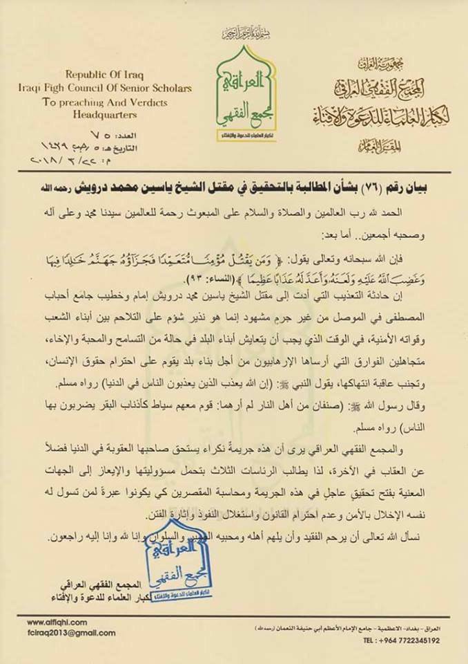 وأضاف البيان:” أن العناصر المتورطين بقتل أمام وخطيب أحد المساجد في الموصل يجب أن ينال عقابه ليكون عبرة لمن تسول له نفسه التجاوز على الأبرياء أو إثارة الفتن في البلاد”، مطالبا الرئاسات الثلاث باتخاذ الإجراءات اللازمة لمعاقبة المتورطين بالحادثة.