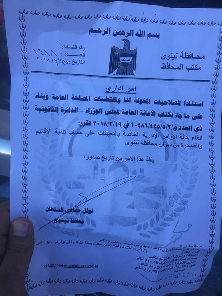 Posted in أهم الأخباربالوثيقة… محافظ نينوى نوفل العاكوب يلغي جميع عقود تنمية الأقاليم في المحافظةby iraq•26 مارس، 2018•0 iraq More by iraq
