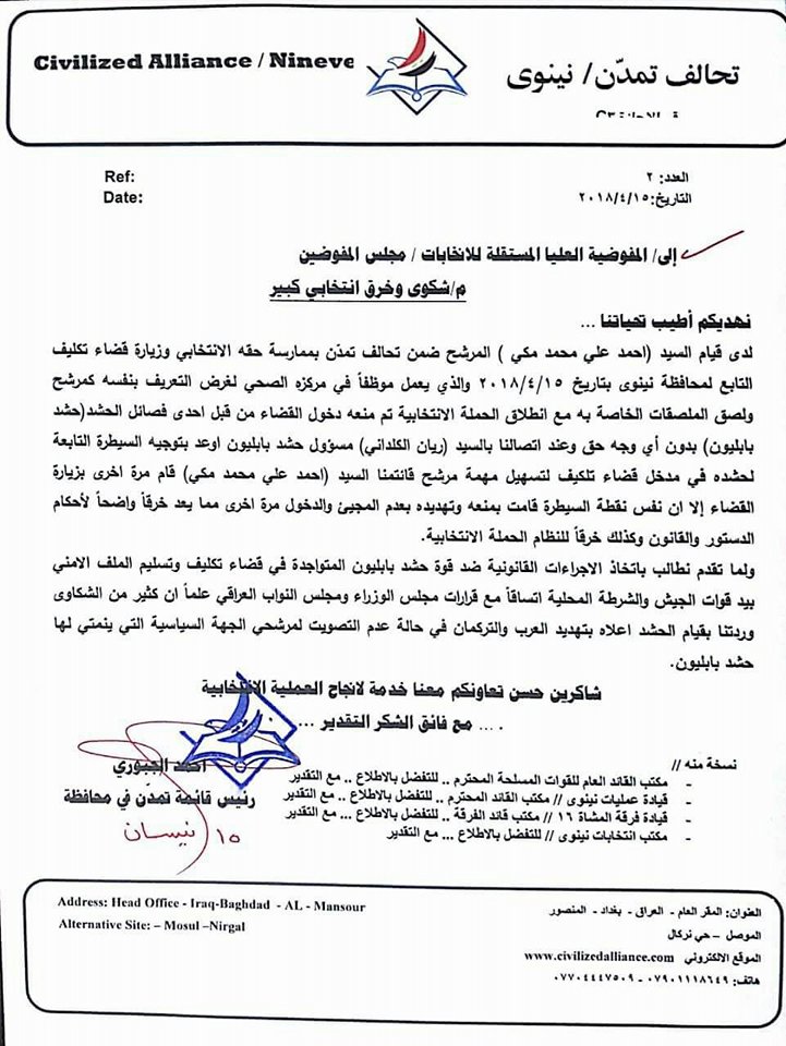 وقال بيان صادر عن تحالف تمدن الانتخابي في نينوى:” ان احد مرشحيها للانتخابات البرلمانية منع من دخول قضاء تلكيف من قبل حشد بابليون الذي يقوده ريان الكلداني لممارسة حقه الانتخابي ولصق الملصقات الخاصة به”.