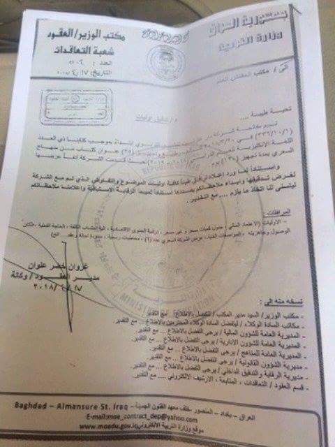 كشفت وثائق اطلعت عليها وكالة انباء عراقيون عن إحالة وزارة التربية عقد طباعة مناهج اللغة الانكليزية الى شركة لبنانية بفارق سعر اعلى عن العطاءات التي قدمتها شركات عراقية بـ 10 مليارات دينار ودون ضرائب.