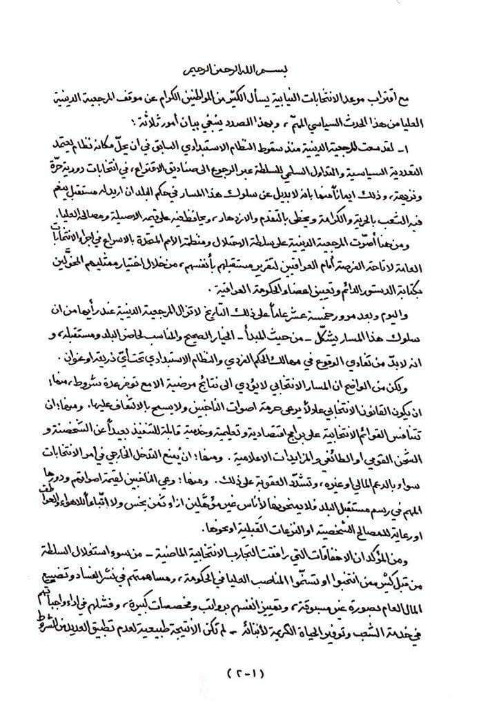 وفيما يلي نص رسالة السيد علي السيستاني:” مع اقتراب الانتخابات، يسال المواطنون عن رأي المرجعية من هذا الحدث السياسي المهم، وبهذا الصدد ينبغى بيان امور ثلاثة: