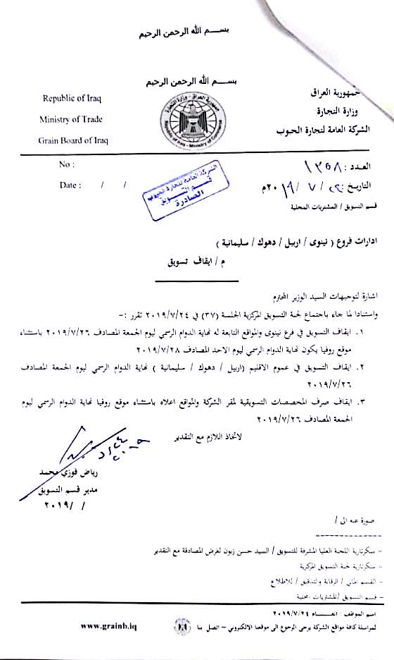 وكانت وزارة التجارة قد أعلنت في بيان رسمي انتهاء حملة التسويق التي بدأت في منتصف نيسان الماضي والتوقف عن استلام اي كميات في عموم محافظات البلاد وأنها حددت يوم ٢٦ من تموز الحالي موعدا لإيقاف التسويق عدا مركز (تسويق روڤيا) في نينوى فيكون ايقاف التسويق فيه يوم ٢٨ من الشهر نفسه.