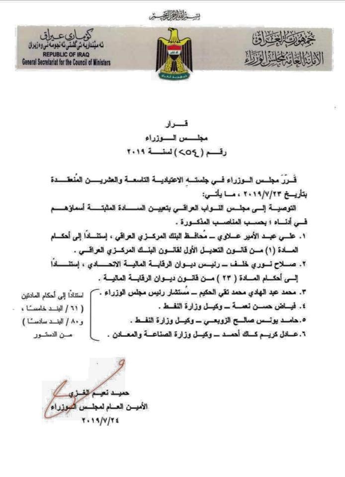 وبحسب وثيقة للأمانة العامة لمجلس الوزراء حصلت وكالة انباء عراقيون على نسخة منها، فان المجلس “قرر التوصية الى مجلس النواب بتعيين (علي عبد الأمير علاوي) محافظاً للبنك المركزي، استنادا الى أحكام المادة 1 من قانون التعديل الأول لقانون البنك المركزي العراقي.