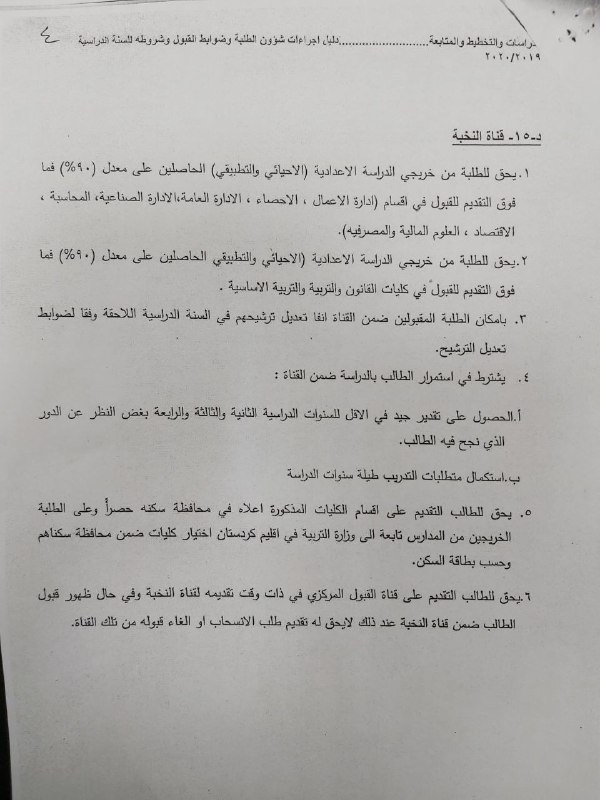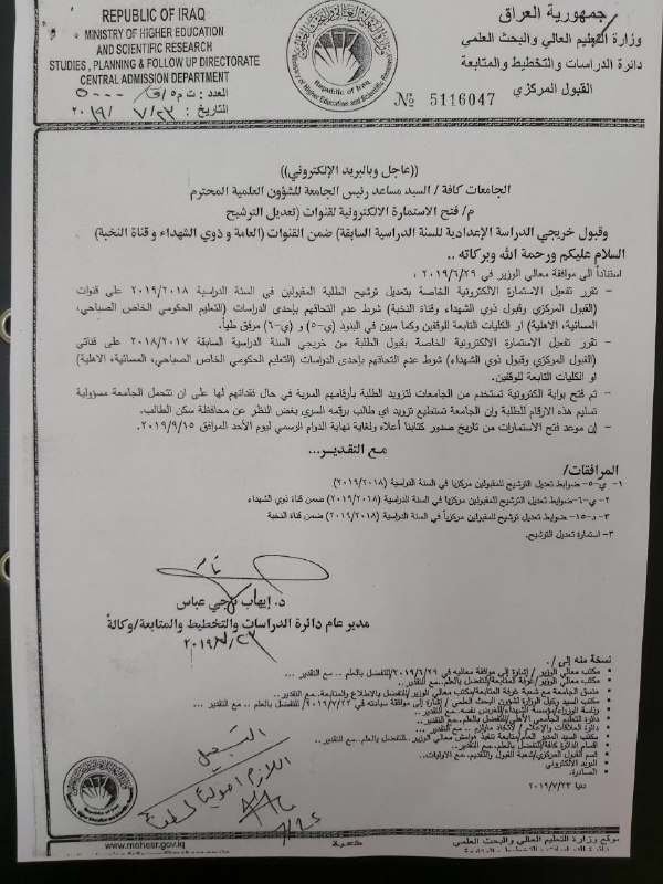اعلنت وزارة التعليم العالي والبحث العلمي، الاحد، عن التعليمات والضوابط الخاصة بالاستمارة الالكترونية لقنوات (تعديل الترشيح وقبول خريجي الدراسة الإعدادية للسنة الدراسية السابقة) ضمن القنوات (العامة وذوي الشهداء وقناة النخبة).