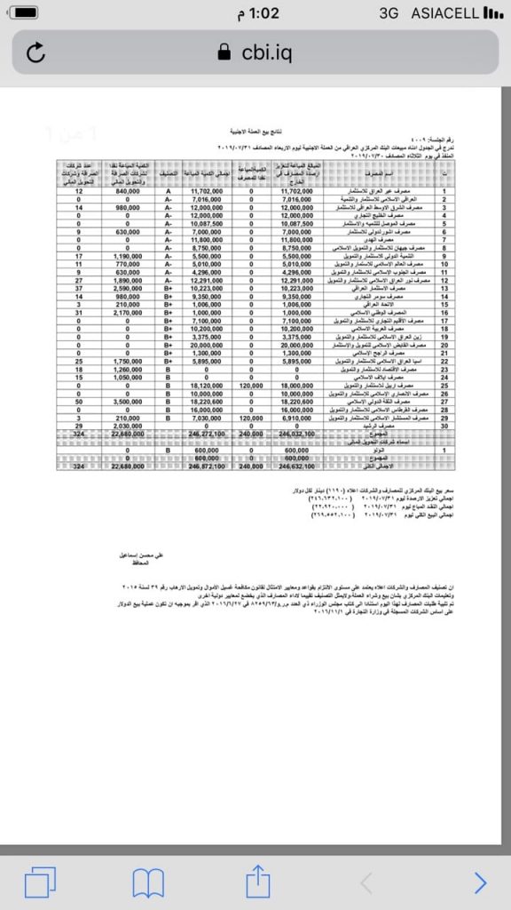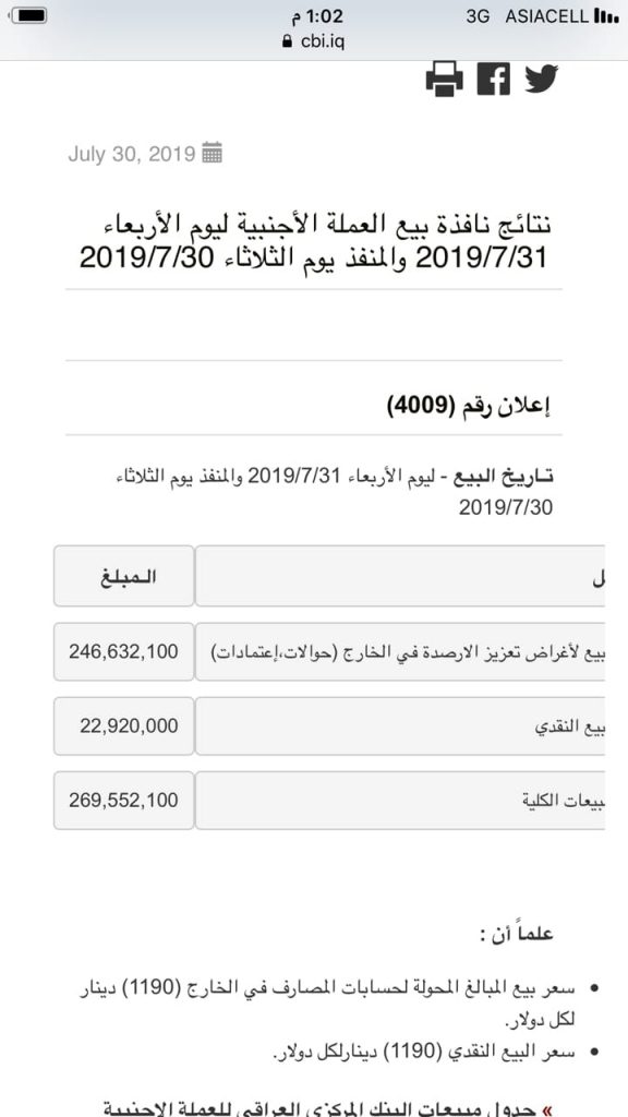 مزاد البنك المركزي العراقي يبيع بمعدل شهري (200) مليون دولار، بمعنى 5 مليار دولار شهرياً مخصومة منها العطل الرسمية، وهذا يعني المعدل السنوي للبيع 60 مليار دولار، وهو ما يعادل قيمة ثلثي الموازنة العراقية السنوية!