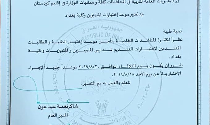 وبين المكتب الاعلامي ان لكثرة المناشدات من قبل اهالي الطلبة الخاصة بالتغيير تم تغير الموعد ليفسح مجال امام جميع الطلبة بالمشاركة بالامتحان واتاحت الفرصة التي تمنحها الوزارة لجميع ابناءها الطلبة.