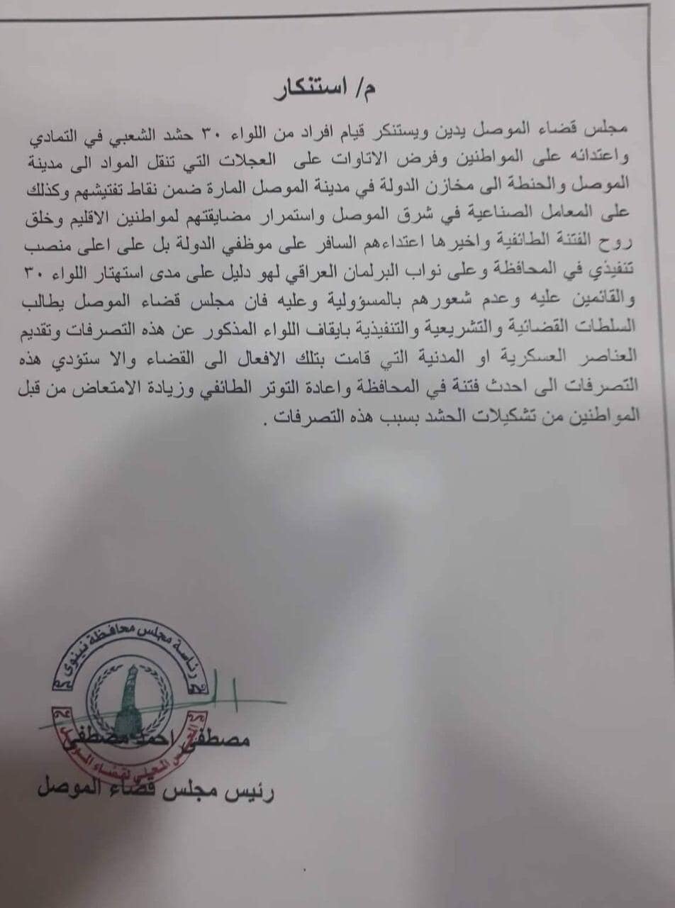 وذكر البيان : أن تمادي عناصر اللواء 30 الحشد الشعبي في الإعتداء على المواطنين وفرض الأتاوات على سواق مركبات الحمل بما في ذلك المواد الغذائية والحنطة إلى مخازن وزارة التجارة في نينوى، بل وعلى أصحاب المعامل شرقي الموصل، من غير المقبول السكوت عليه.