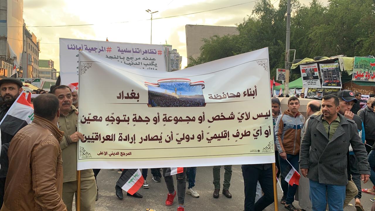 شهدت ساحة التحرير وسط العاصمة بغداد يوم الجمعة توافد اعداد كبيرة من المتظاهرين وذلك لمواصلة الاحتجاجات التي انطلقت منذ اوائل اكتوبر الماضي وادت الى اسقاط الحكومة الاتحادية برئاسة عادل عبد المهدي بضغط من المرجعية العليا للشيعة في العراق المتمثلة بآية الله علي السيستاني.