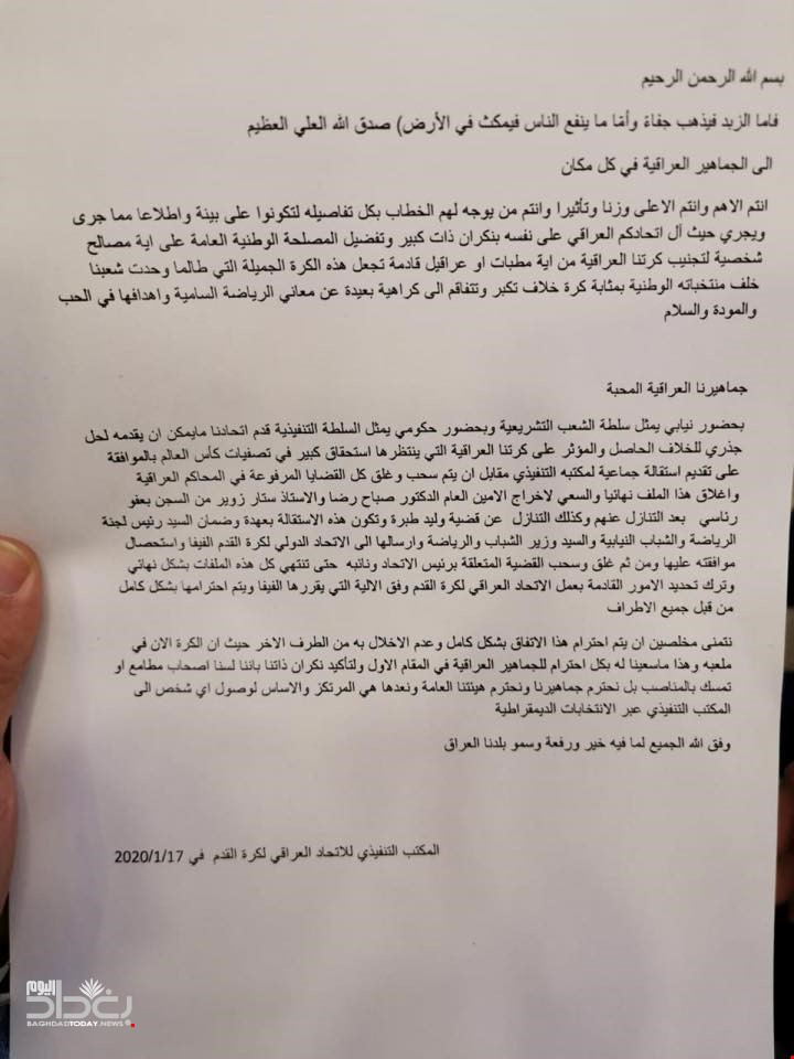 أصدر الاتحاد العراقي لكرة القدم، بياناً رسمياً بشأن الاستقالة الجماعية لأعضائه مقابل تنازل النجم الدولي السابق عدنان درجال عن جميع القضايا التي رفعها ضد الاتحاد