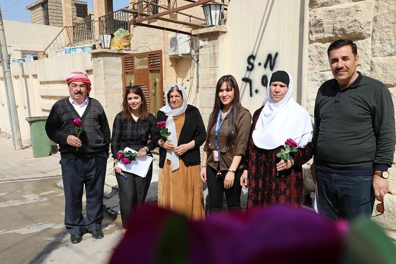 ضمن مشروع مدّ الجسور بين مجتمعات نينوى إحتفلت منظمة “جسر إلى – UPP الإيطالية” بيوم المرأة العالمي في ناحيتي برطلة وبعشيقة وقضاء الموصل صباح هذا اليوم الأحد 8 آذار 2020 تحت شعار ” إنّ أعظم هدية للمرأة في هذا اليوم هو إيقاف العنف ضدّها”. أنطلقت المبادرة في بعشيقة حيث استضاف مركز مشروع مدّ الجسور بين مجتمعات نينوى مجموعة نساء من كافة مكونات المنطقة، وبدأ نشطاء المشروع بالحديث عن أهمية دور المرأة في الحياة وتشجيعها للمشاركة في صناعة التغيير وتحقيق السلام في المجتمعات ما بعد مرحلة النزاعات، وبعد ذلك بدأت النساء بالحديث عن تجاربهن في خدمة المجتمع المدني وخدمة مجتمعات بعشيقة، وكذلك الحال في برطلة حيث زار نشطاء المشروع بيوت لعدّة نساء وهنّأوا المرأة باليوم العالمي للمرأة من أجل إيصال رسالة بأنّ الحياة عادت وأنّ واقع المرأة إختلف وأصبحت المرأة هي الدعامة الأساسية في المجتمع، وبعد ذلك زار نشطاء المشروع في مدينة الموصل النساء العاملات في مراكز عملهن من أجل تشجيعهن ودعمهن وإيصال صوتهن بأنّ المرأة تستطيع أن تعمل وأن تكون جزءاً من المجتمع.