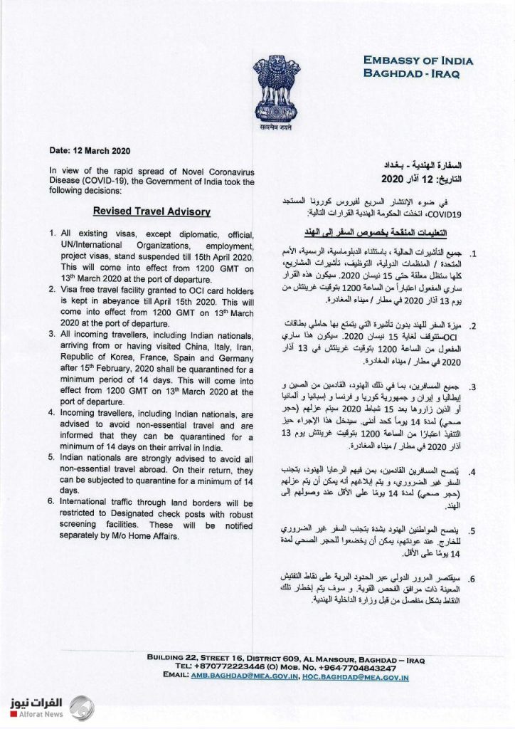 وأصدرت السفارة الهندية في بغداد بياناً توضح فيه قرارات بلاده في تعليق منح تأشيرات الدخول لعدة دول بيها العراق بسبب كورونا.