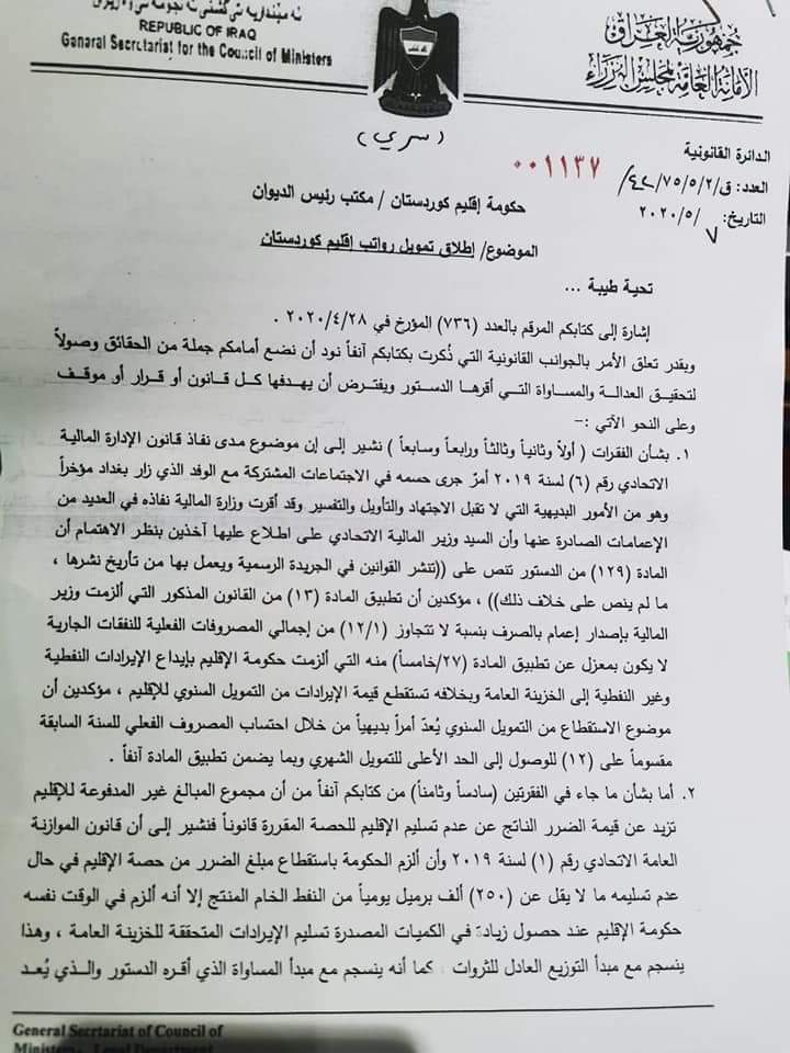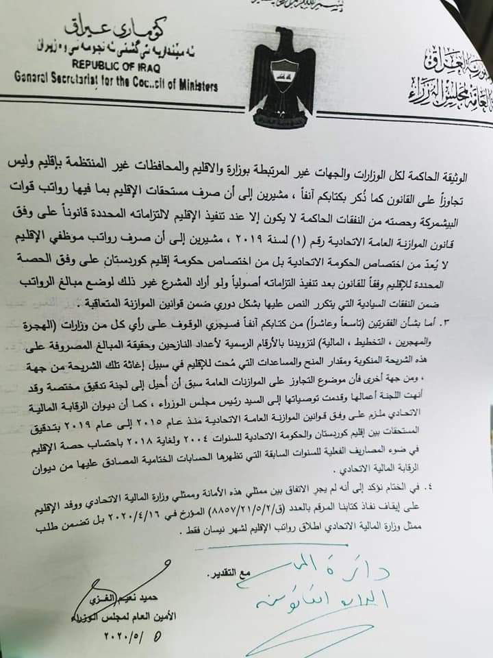 بلغت امانة مجلس الوزراء أقليم كوردستان بكتب رسمية حصلت وكالة انباء عراقيون على نسخة منها بأنه ” ليس من واجب بغداد تأمين رواتب موظفي الاقليم لأن رواتبهم من ضمن الحصة المقررة من الموازنة العامة للأقليم “