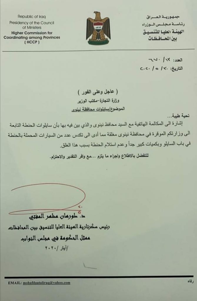 حصل محافظ نينوى نجم الجبوري على موافقة وزارة التجارة على استلام محصول الحنطة من فلاحي نينوى عبر بيان حصلت وكالة أنياء عراقيون جاءت هذه الموافق عقب ايعاز رئيس الهيئة العليا للتنسيق بين المحافظات الدكتور طورهان المفتي للوزارة بفتح أبواب السايلوات التابعة لها إثر تكدس السيارات المحملة بالمحصول وبكميات كبيرة .