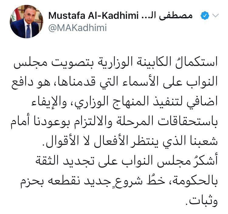 وغرد الكاظمي على صفحته الشخصية في تويتر بعد الموافقة على كابينته شاكراً مجلس النواب على تجديد الثقة الحكومة ، مشيراً الا انها خط شروع جديد نقطعه بحزم وثبات .