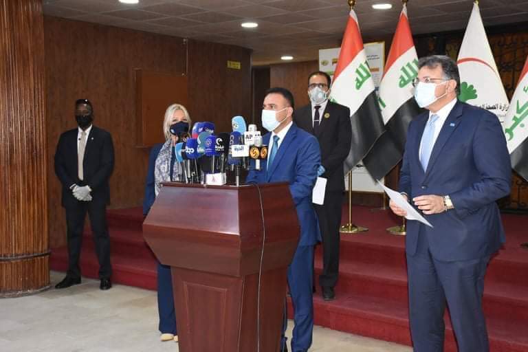 عراقيون/متابعة/ عقدت وزارة الصحة العراقية اجتماع ومؤتمر صحفيا مع منظمة الصحة العالمية وبعثة الامم المتحدة لمساعدة العراق (يونامي) في مقر وزارة الصحة اليوم الاربعاء الموافق ٢٤ حزيران ٢٠٢٠ برئاسة السيد وزير الصحة والبيئة الدكتور حسن محمد التميمي وممثل منظمة الصحة العالمية في العراق الدكتور ادهم اسماعيل والممثلة الخاصة للامين العام لبعثة الامم المتحدة السيدة جنين هينيس بلاسخارت .