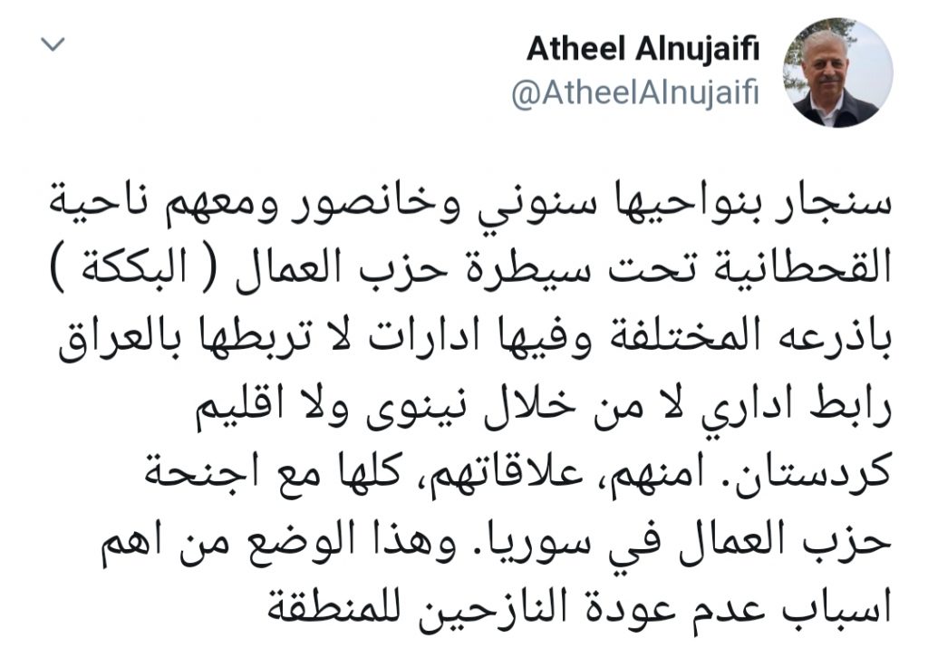 عراقيون /نينوى/قال القيادي في جبهة الإنقاذ والتنمية ومحافظ نينوى الأسبق أثيل النجيفي عبر تغريدة في تويتر تابعتها وكالة أنباء عراقيون “من اهم اسباب عدم عودة النازحين الى سنجار بنواحيها سنوني وخانصور ومعهم ناحية القحطانية لأنها تحت سيطرة حزب العمال ( البككة ) باذرعه المختلفة “