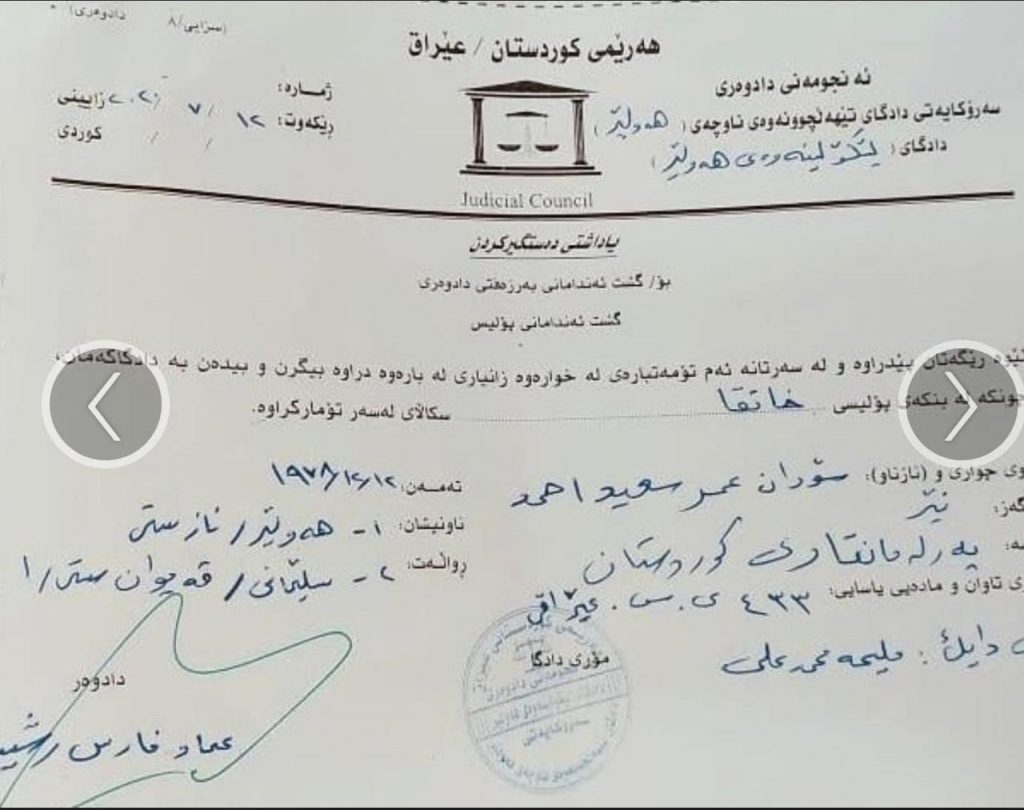 وجاء في المذكرة أن “المحكمة تخول جميع اعضاء الانضباط العدلي وجميع منتسبي الشرطة وتأمرهم بالقاء القبض على المتهم وتسليمه للمحكمة بسبب وجود شكوى ضده في مركز شرطة خانقا في اربيل”.