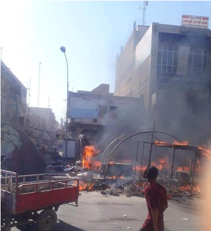 وقال المصدر لوسائل إعلام محلية، إن “الحريق الكبير التهم بناية تجارية وساط الحبوبي وامتد إلى خيم الاعتصام، وأحرق أكثر من 15 خيمة متواجدة في الساحة”.