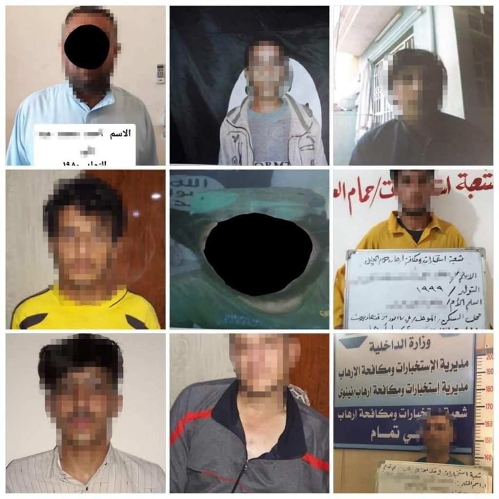 نينوى /عراقيون / اعلنت المديرية العامة للاستخبارات ومكافحة الإرهاب القبض على (٩) إرهابيين بمناطق متفرقة من محافظة نينوى ، وقالت المديرية في بيان تلقت /عراقيون / نسخة منه ان ا إعتقلت مطلوبين وفق احكام المادة 4 ارهاب لانتمائهم لعصابات داعش الإرهابية، مشيرة إلى انهم اعترفوا باشتراكهم بعدة عمليات إرهابية ضد القوات الأمنية وقتل وتهجير وفرض اتاوات على المواطنين أثناء سيطرة داعش الإرهابية على المحافظة آنذاك، مضيفة انه تم تدوين أقوالهم وإحالتهم للقضاء لإكمال أوراقهم التحقيقية لينالوا جزاءهم العادل.