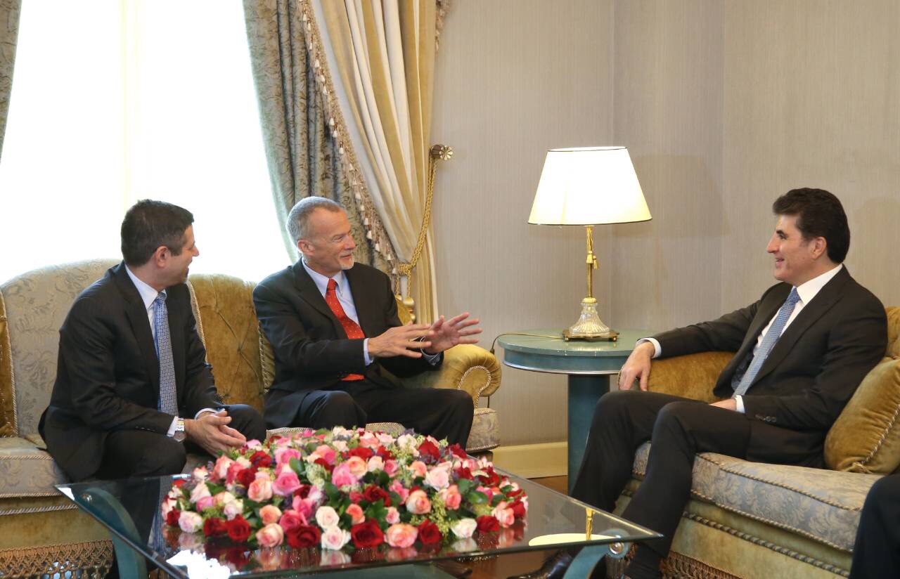 استقبل نيجيرفان بارزاني رئيس حكومة اقليم كردستان كين كروس القنصل الامريكي السابق في اقليم كوردستان وستيف فاكن القنصل الجديد ووفد مرافق لهما.
