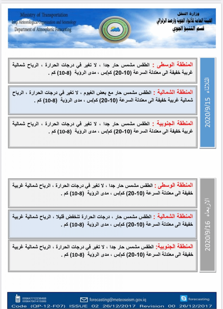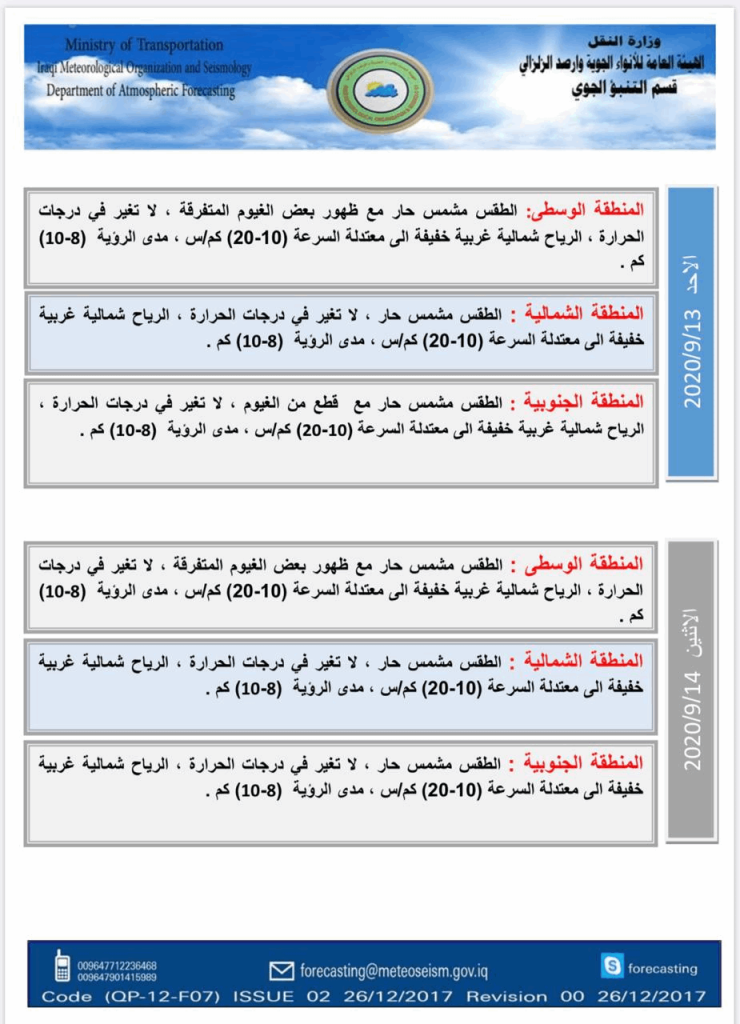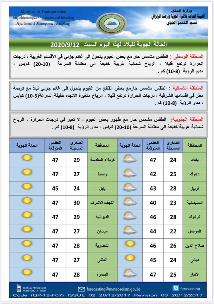 توقعت هيئة الأنواء الجوية، السبت، أن يكون الطقس خلال الأسبوع الحالي مشمساً حاراً ورطباً، فيما ستسجل درجات الحرارة العظمى في بغداد هذا اليوم 47 درجة مئوية.