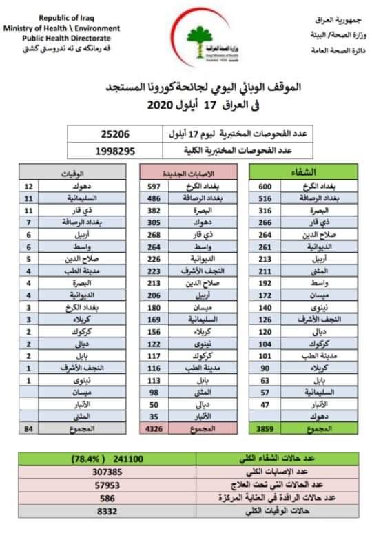 وسجلت وزارة الصحة 4326 اصابة جديدة بكورونا و3859 حالة شفاء فضلاً عن 84 وفاة بسبب الفايروس.