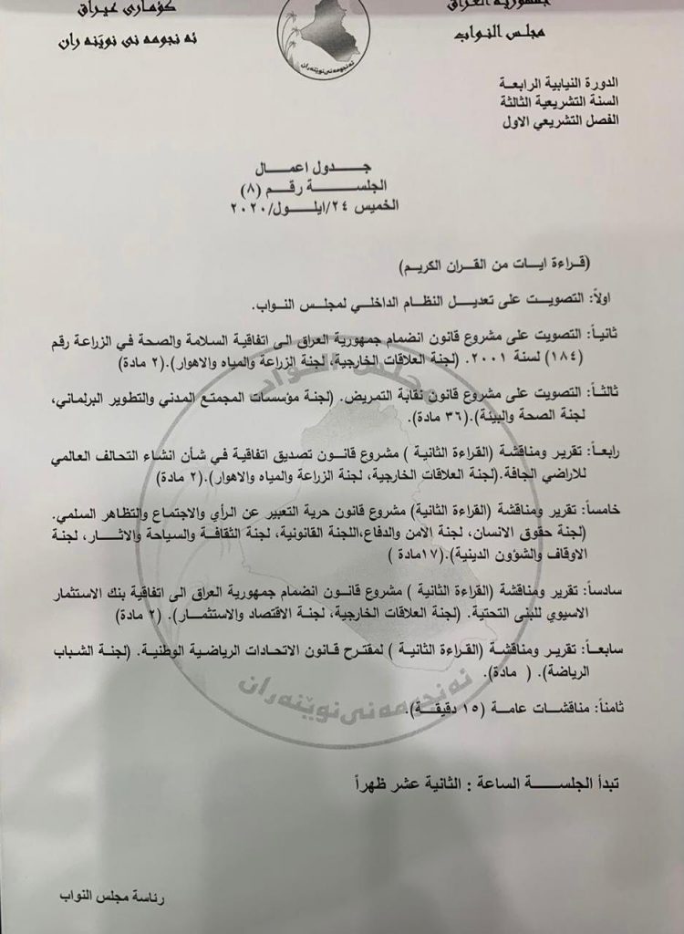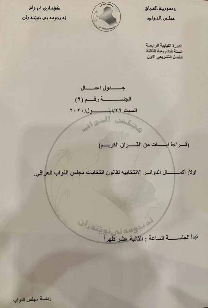 Posted in أهم الأخبار اخبار العراقجدول أعمال مجلس النواب في جلستي الخميس والسبت (وثائق)by •22 سبتمبر، 202022 سبتمبر، 2020•0 تنشر وكالة “عراقيون” جدول أعمال مجلس النواب ليومي الخميس، والسبت المقبلين. More by