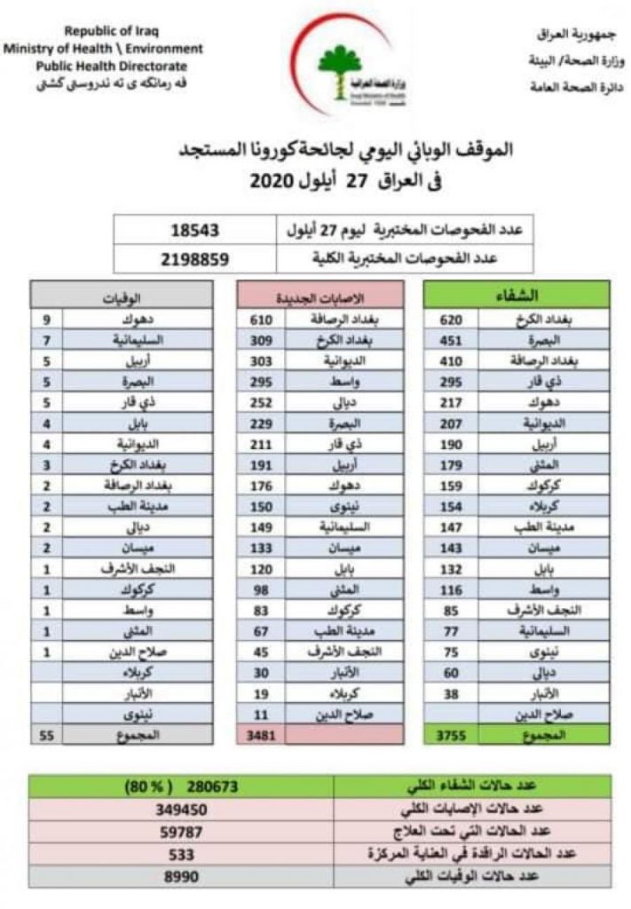 Posted in أهم الأخبار اخبار العراقبالوثيقة … الصحة تسجل 3481 إصابة جديدة بالوباء و 55 وفاة و 3755 حالة شفاءby iraq•27 سبتمبر، 202027 سبتمبر، 2020•0 متابعة/عراقيون/ iraq More by iraq
