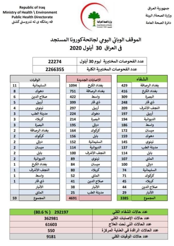 Posted in أهم الأخبار اخبار العراقالصحة تعلن تسجيل 4691 اصابة جديدة بكورونا في عموم العراقby iraq•30 سبتمبر، 202030 سبتمبر، 2020•0 متابعة/عراقيون/ اعلنت وزارة الصحة، الاربعاء، عن الموقف الوبائي اليومي بشأن كورونا في عموم العراق. iraq More by iraq