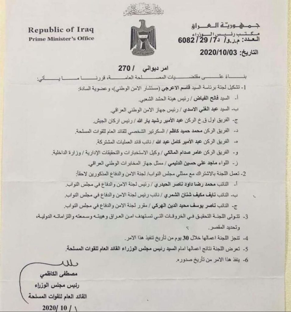 عراقيون/بغداد/ أصدر رئيس الوزراء مصطفى الكاظمي أمراً ديوانيا يقضي بتشكيل لجنة برئاسة مستشار الامن الوطني قاسم الاعرجي للتحقيق بالهجمات التي تستهدف تهدد امن العراق وسمعته الدولية.