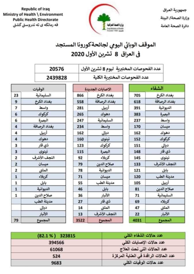 أعلنت وزارة الصحة والبيئة، اليوم الخميس، الموقف الوبائي اليومي لفيروس كورونا المستجد في عموم العراق.