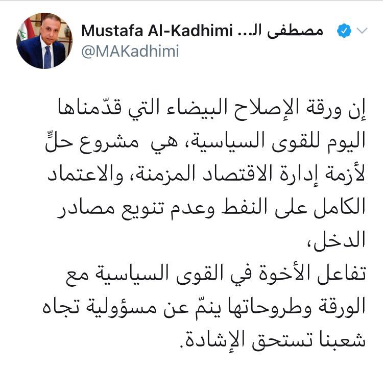 عراقيون /متابعة/ قال رئيس الوزراء مصطفى الكاظمي إن ورقة الإصلاح البيضاء التي قدّمناها اليوم للقوى السياسية، هي مشروع حلٍّ لأزمة إدارة الاقتصاد المزمنة، والاعتماد الكامل على النفط وعدم تنويع مصادر الدخل،