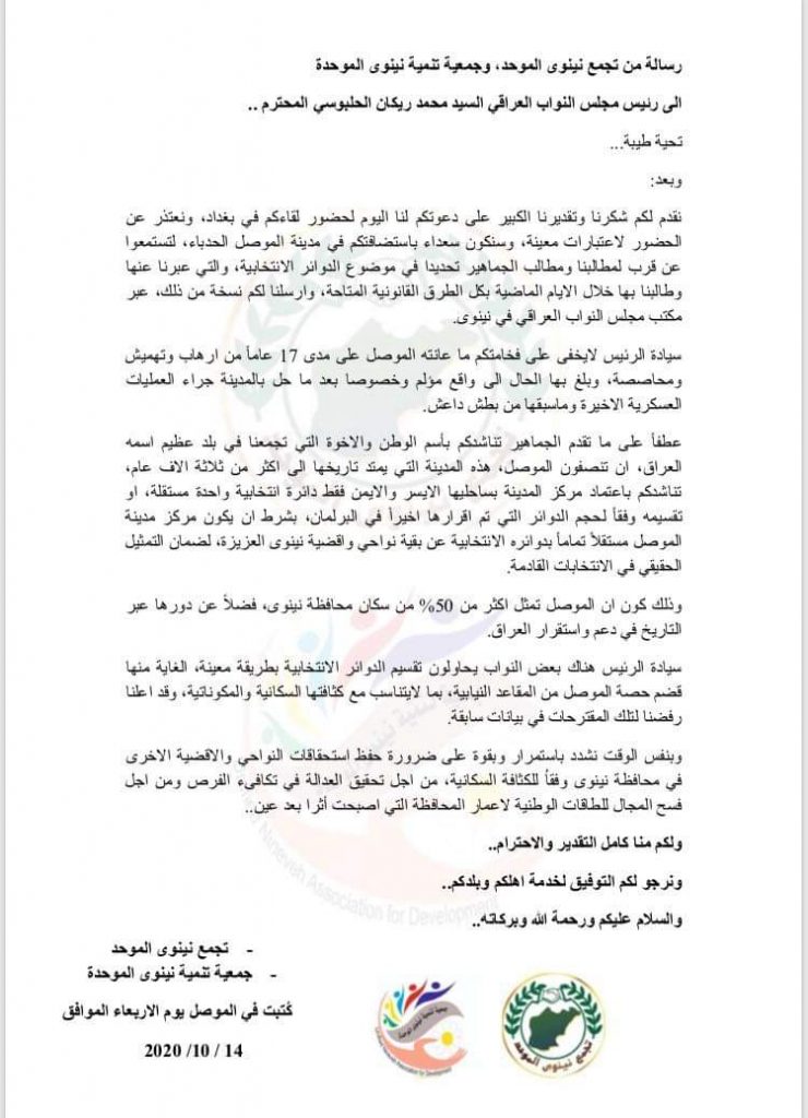 وأضاف البيان ” نطلب ان يكون مركز محافظة نينوى ،مدينة الموصل بساحليها الايسر والايمن فقط دائرة انتخابية واحدة مستقلة، وذلك كون الموصل تمثل اكثر من 50% من سكان نينوى”.