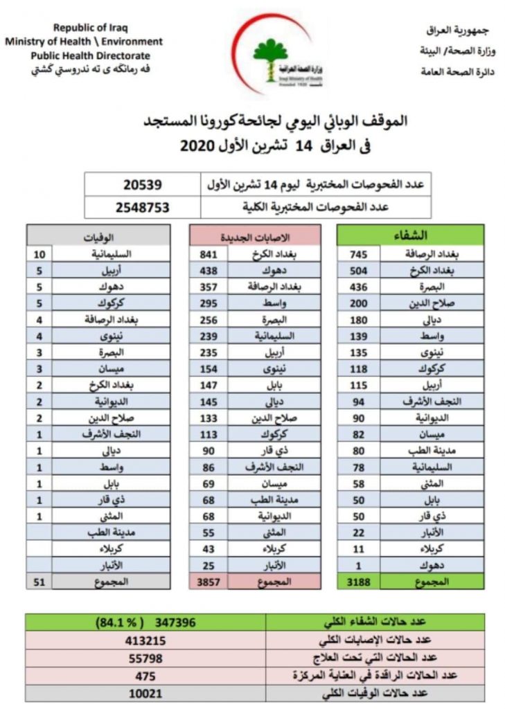 ارقام الاصابات والوفيات والتعافي بكل محافظة على حدة مبينة في الموقف الوبائي وبالارقام داخل الخبر.