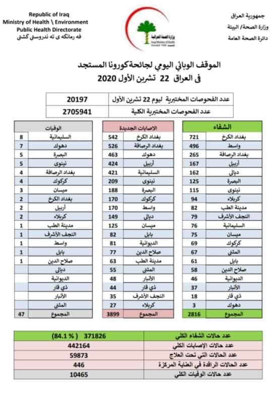 وذكرت الصحة في جدول بياني، أنها سجلت اليوم 47 حالة وفاة و 3899 اصابة جديدة بالفيروس قابلتهما 2816 حالة تعافٍ منه.