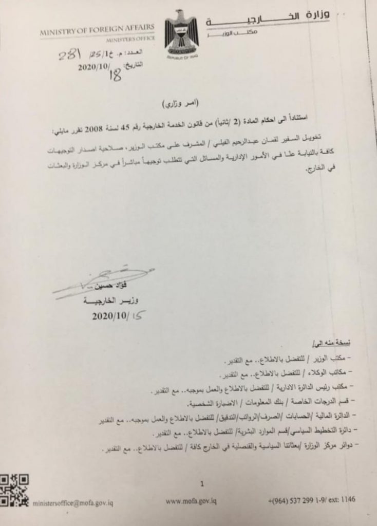 جاء ذلك في أمر وزاري صادر عن حسين بتاريخ 15 تشرين الأول/أكتوبر الجاري، “تخويل السفير لقمان عبد الرحيم الفيلي / المشرف على مكتب الوزير، صلاحية إصدار التوجيهات كافة بالنيابة عنا في الأمور الإدارية والمسائل التي تتطلب توجيهاً مباشراً في مركز الوزارة والبعثات في الخارج” .