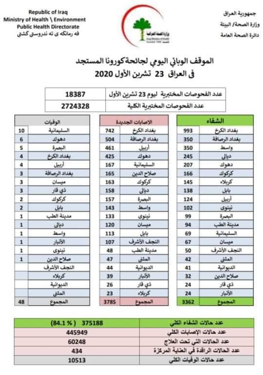 وأضافت الصحة في بيان حصلت عراقيون على نسخة منه ان “عدد الإصابات لهذا اليوم هو 3785 ، وعدد حالات الشفاء 3362 ، وعدد حالات الوفاة 48 “.