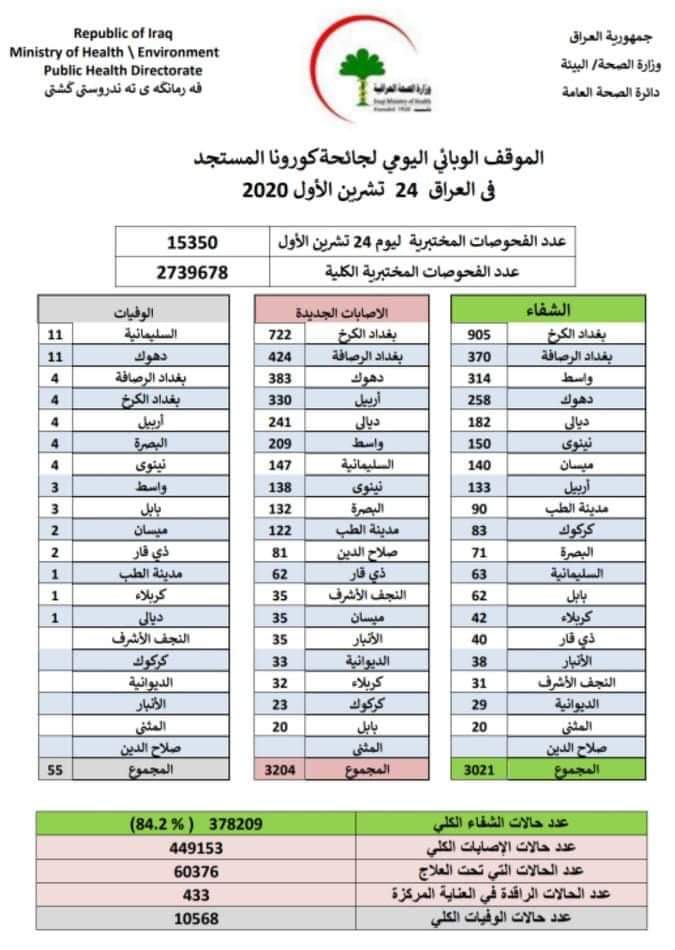 اعلنت وزارة الصحة الموقف الوبائي لفايروس كورونا في العراق ، واضافت في بيان لها “سجلت مختبراتها هذا اليوم 3204 إصابة جديدة و3021 حالة شفاء ، و55 حالة وفاة” .