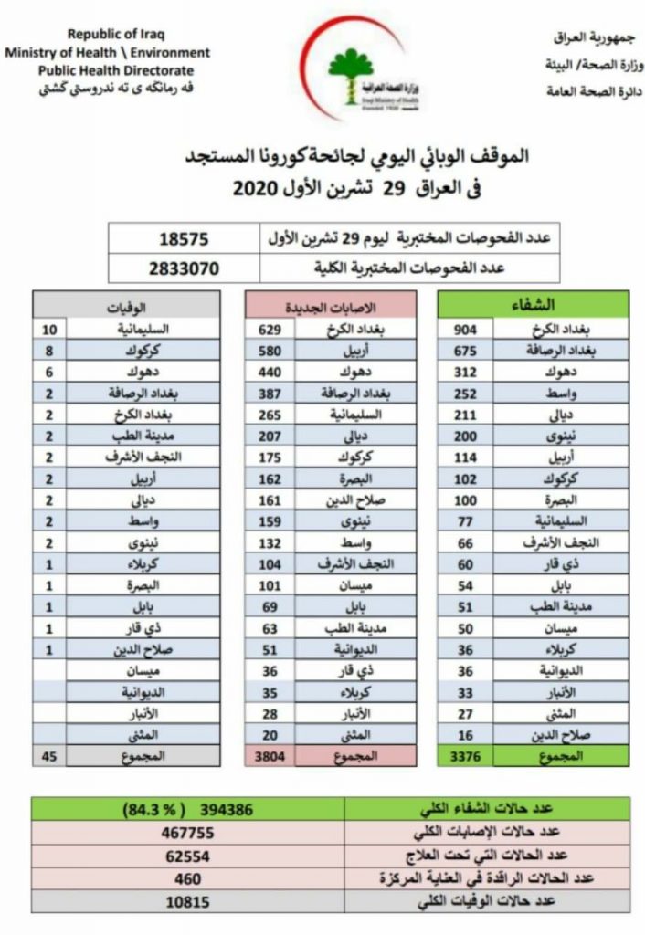 عراقيون/متابعة/ أعلنت وزارة الصحة الموقف الوبائي اليومي لفايروس كورونا في العراق .