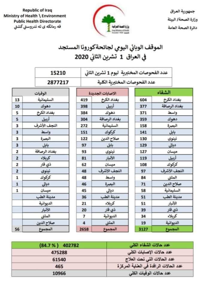 وذكرت الصحة في بيان حصلت عراقيون على نسخة منه ” تم تسجيل 2658 إصابة جديدة ، و 3127 حالة شفاء ، و56 حالة وفاة .